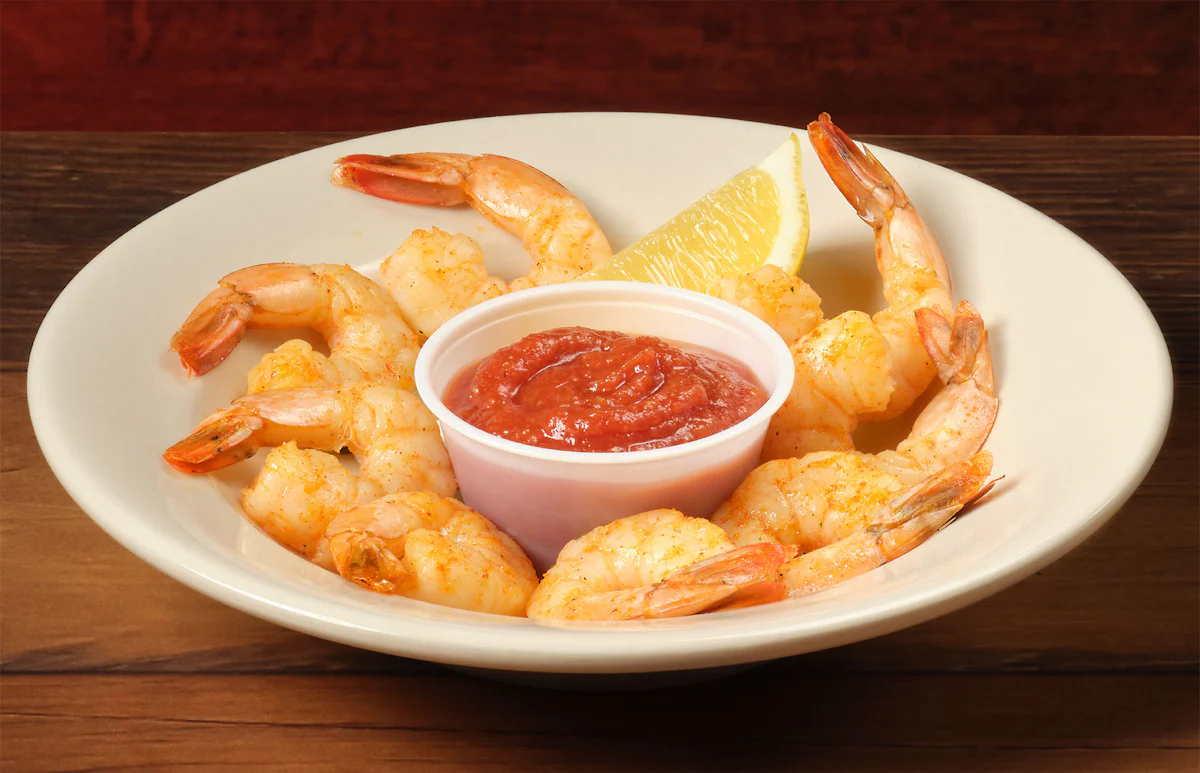 8 Chilled Shrimp served with made-from-scratch cocktail sauce (110 cal.) and Lemon. (320 cal.)